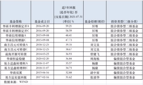 一方面,数量和发行规模都出现快速增长,另一方面,近一年股债市场大幅震荡,“固收+”基金业绩分化不断加剧。数据显示,截至7月29日,可统计数据的1000多只“固收+”基金(份额分开计算),近一年平均收益率为6.87%,九成以上产品收获正回报。其中,厉骞管理的华商丰利增强定开A、华商信用增强A近一年收益率分别为59.21%、48.41%,刘文良管理的南方昌元可转债、曾健飞管理的前海开源可转债、杨康管理的易方达鑫转增利、张清华管理的易方达安盈回报等产品同期业绩也超过30%。