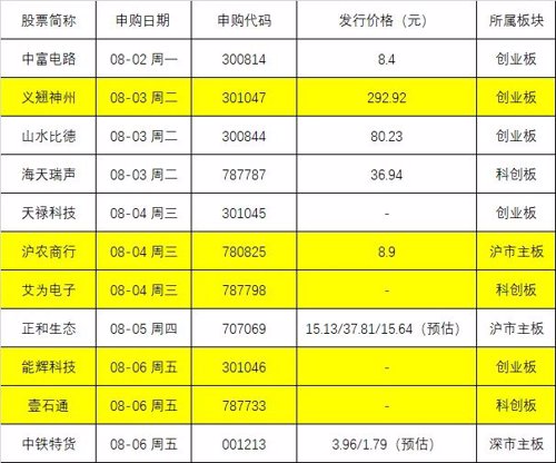 此外,还有多个热门赛道股,如8月4日周三发行的芯片股艾为电子,8月6日周五发行的锂电股壹石通、光伏股能辉科技;以及8月4日周三发行的容易中签的银行股沪农商行。