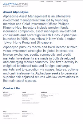 依据其官网介绍,Alphadyne作为一家另类投资管理公司,由创始成员兼首席投资官 Philippe Khuong-Huu 领导。投资者包括养老基金、保险公司、资产管理公司、投资顾问和主权财富基金。公司成立于2005年,在纽约、伦敦、东京、香港和新加坡设有办事处。