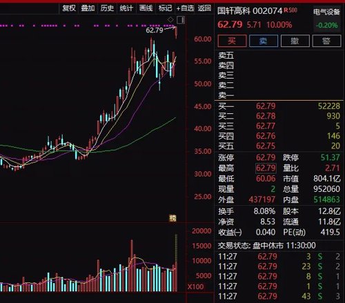 虽然巨头宁德时代、比亚迪有所回调,但800亿市值的锂电龙头国轩高科还是涨停创新高。