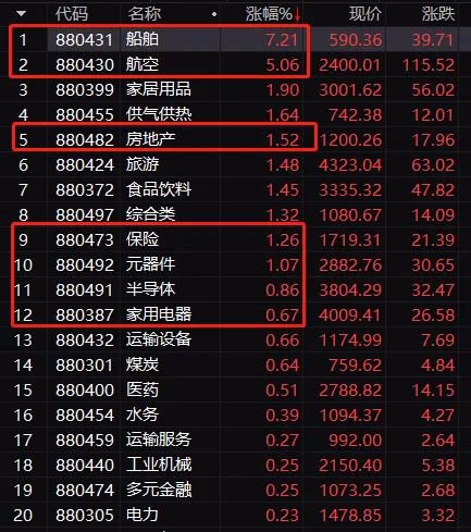 军工股突然暴动起来,船舶板块暴涨超7%,航空也涨超5%;房地产、食品饮料、保险等板块也都涨起来了。