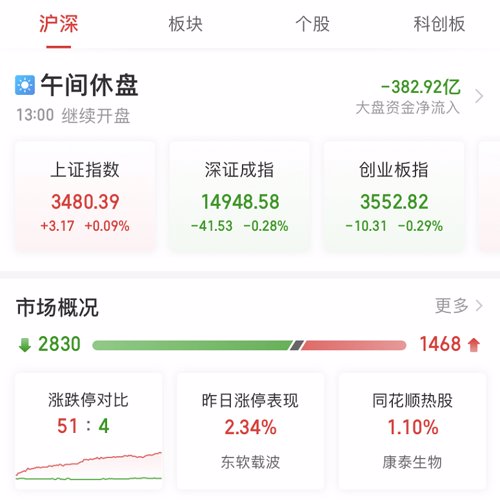 今日上午市场整体波动不大,下跌的个股数量很多。上午收盘,上证指数微涨0.09%,深证成指跌0.28%,创业板指数跌0.29%,科创50指数涨0.28%,两市成交额8305亿元,个股跌多涨少,2830个下跌,1468个上涨。