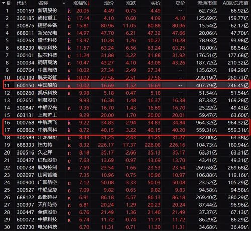 军工股当中,700多亿的中国船舶涨停,市值近千亿的中航西飞涨超9%,500多亿的中航高科涨近9%。