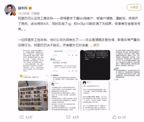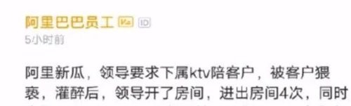8月7日,有被认为是阿里巴巴员工的网友在社交平台发帖称,在出差过程,被其领导要求在KTV陪客户喝酒,被灌酒后遭到客户猥亵。同时,女员工举报称,事后查看酒店录像,当天夜里该领导多次进入女员工酒店房间,涉嫌性侵。
