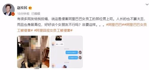 随后8月8日凌晨,赵宏民更新了多条该事件的微博,其中更是称似乎已找到了涉事的男上司: