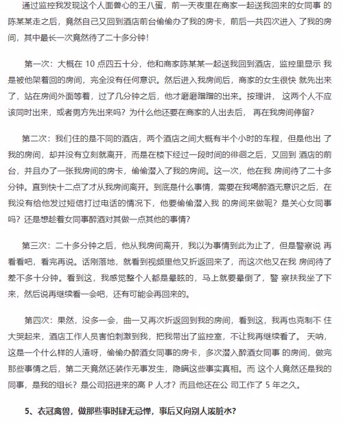 据爆料显示,侵害女员工的领导为阿里的王成文,受害者称王成文在其醉酒之后四次进入其房间,对她实施侵害。