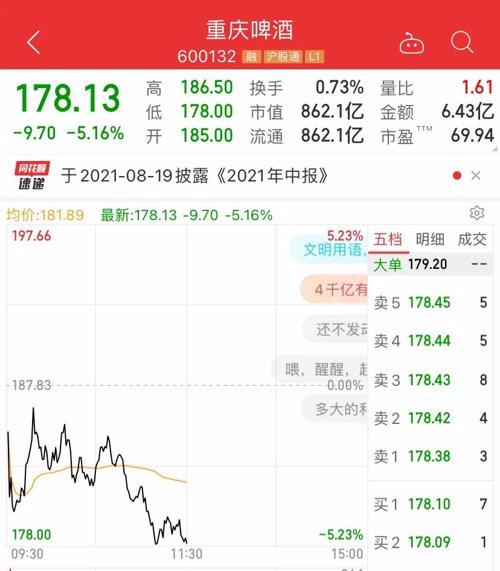 重磅的5G龙头中兴通讯、啤酒股龙头重庆啤酒也都暴跌。