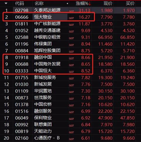 港股地产股方面,融创中国、中国恒大、华润置地、新城发展等都纷纷大涨,融创中国、中国恒大涨超8%。