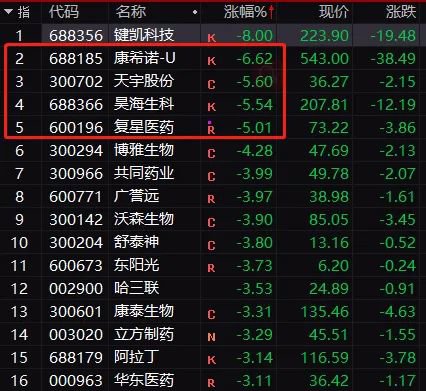 疫苗龙头康希诺大跌6.62%。万泰生物、复星医药等也跌超5%,通策医疗也大跌4.66%。