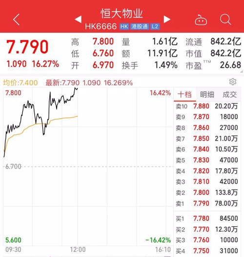 公告要出让部分股权的恒大物业大涨超16%。