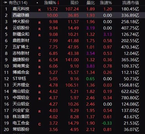 有色板块当中,神火股份、云铝股份、五矿稀土、湖南黄金等大涨。