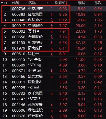 具体来看,中交地产涨停,龙头保利地产、金地集团早上开盘后快速拉涨停,上午收盘仍涨超9%,万科A一度涨超9%,金科股份、新城控股、招商蛇口等也纷纷大涨。