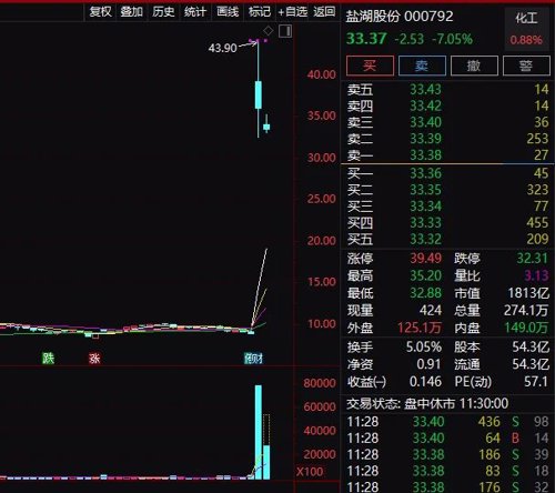 昨日恢复上市的盐湖股份,今天上午暴跌7.05%,市值1813亿元。