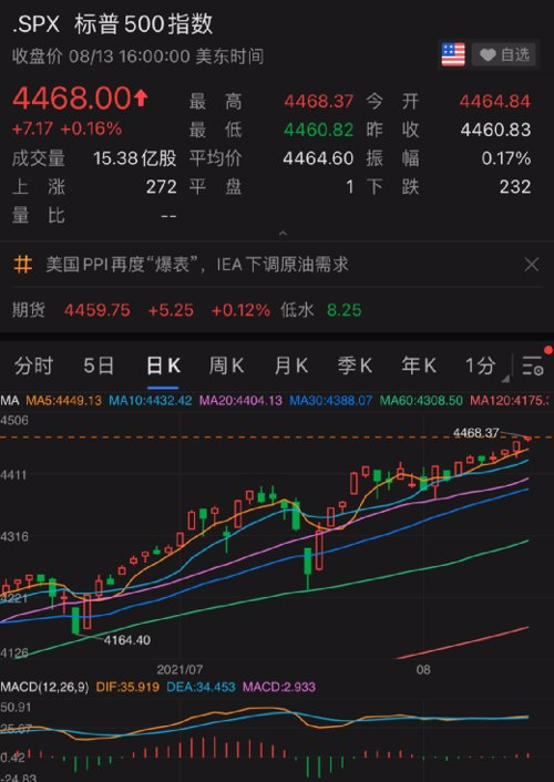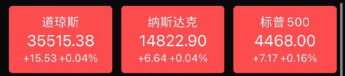 截至收盘,标普500指数涨0.16%,报4468点;纳斯达克指数涨0.04%,报14822.90点;道琼斯指数涨0.04%,报35515.38点。
