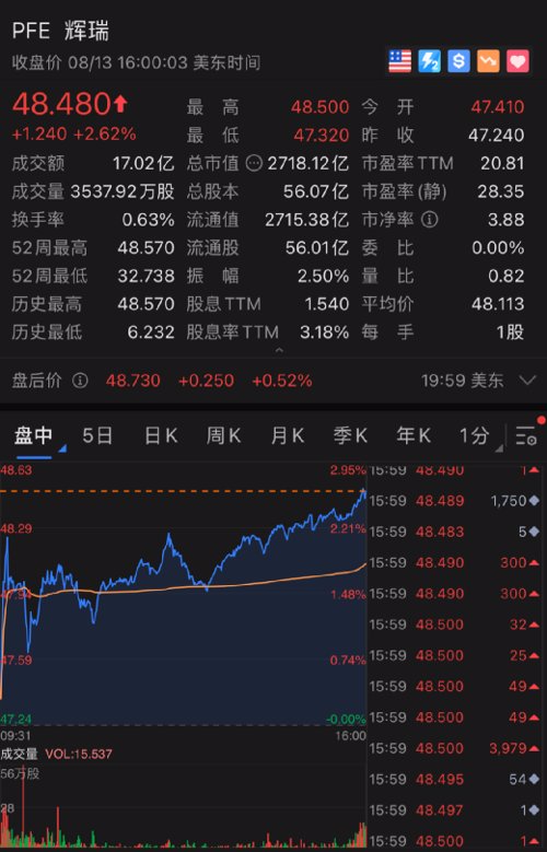 周四已经上涨2%的辉瑞,在周五再涨2%,市值上涨69.39亿美元,约合450亿人民币。