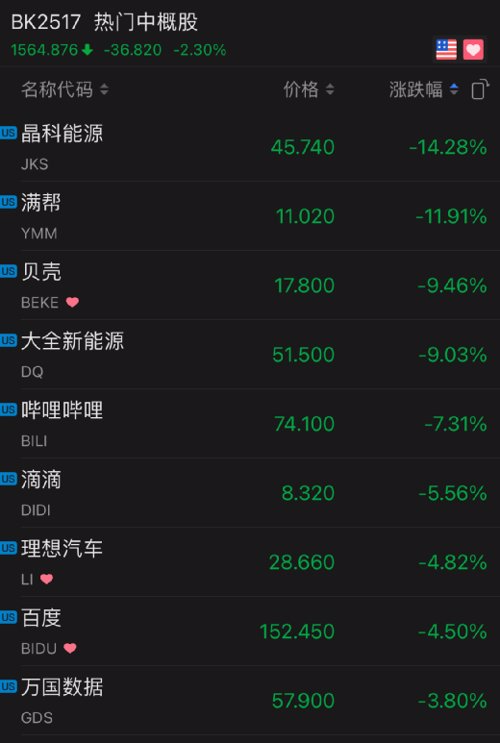 周五,热门中概股表现整体跑输大盘。晶科能源跌超14%,满帮跌近12%,贝壳跌超9%,滴滴跌超5%。
