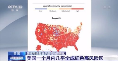 据央视,美国有线电视新闻网本周报道称,现在有超过98%的美国人所处地区,存在高水平或大量的社区传播风险。而一个月前这一数字还是19%。报道对比了7月5日到8月9日之间的疫情地图。地图分别用蓝色、黄色、橙色、红色来代表社区传播风险从低到高的水平。7月5日时,地图上代表社区传播高风险的红色部分还比较少,随后每周疫情地图显示,最近一个月红色部分占比越来越大。到8月9日,红色的高风险地区几乎占满美国全境。