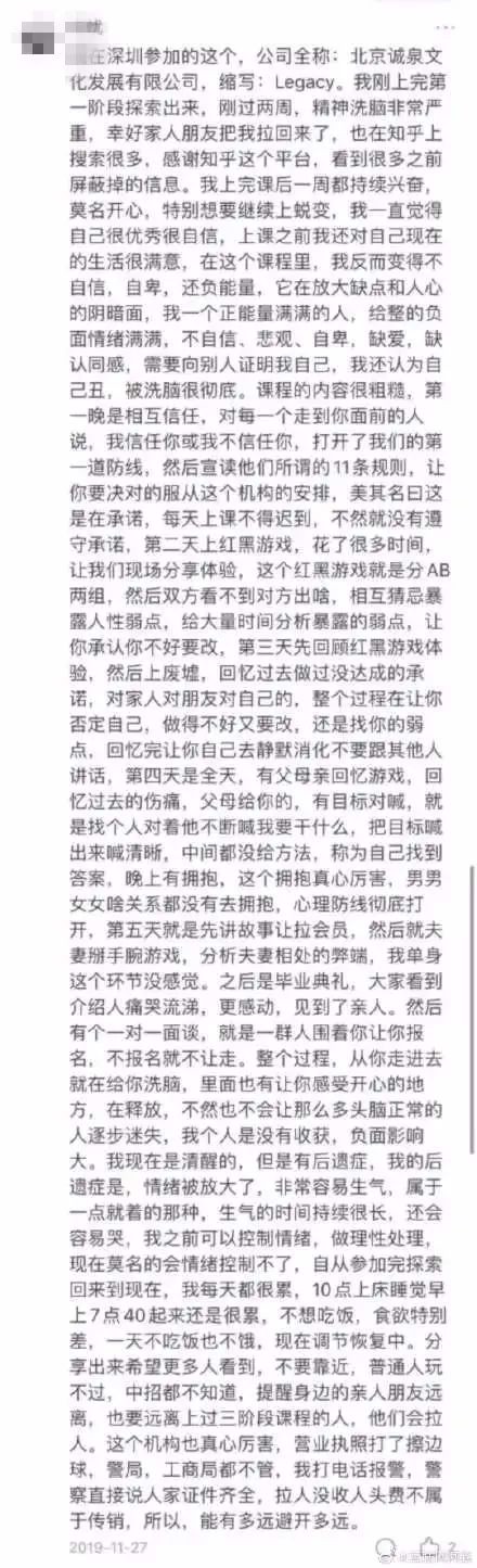 一名曾在深圳参加过类似“心灵课程”的投资人告诉记者,与上面截图中所说的情况类似,这类课程在比较极端的情况下会采取一种侮辱学员、严重打压其自尊的方式来进行,理念就是“要彻底摧毁才能重建”。但并不是所有人都能接受和承受这样的方式,因此之前也有人把这类课程称为“精神控制”。