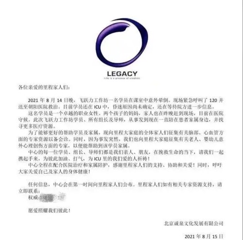 8月15日,一则来自北京诚泉文化发展有限公司发布的公告显示,8月14日晚飞跃力工作坊一名学员在课室中意外晕倒。现场紧急呼叫了120并将其送至朝阳医院救治,并称这名学员“是一个卓越的职业女性,两个孩子的妈妈”。