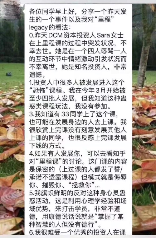 行业内知名女投资人、DCM董事总经理魏萌近日在参加名为“飞跃力工作坊”的课程中意外晕倒,不幸去世,年仅32岁。更令人诧异的是,有参加过类似培训的人士称,该课程疑似“精神控制”,给人精神洗脑很厉害。