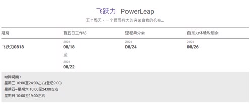 此外,不少学员都反映课程时间安排非常密集,基本上全天的课程是从早上到晚。官网显示,飞跃力工作坊中上课时间是周三到周六从早上10点到晚上24点,周日是早上10点到晚上19点。