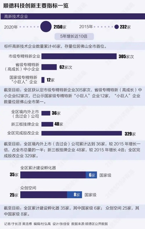 近年,顺德区通过对一批拥有核心技术、成长性好、发展潜力大的企业精准培育,已有效推动高新技术企业实现量与质的跨越式发展:高企存量从2015年的232家预计增长到2020年的2150家,“十三五”期间增长近10倍;标杆高企存量46家,居佛山首位。