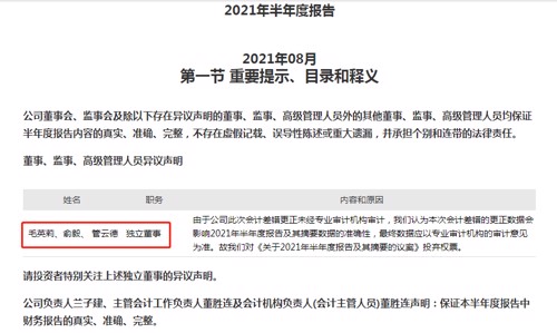 8月20日晚间,星星科技发布了公司2021年半年报。毛英莉、俞毅、管云德三位独立董事对半年报提出异议声明。