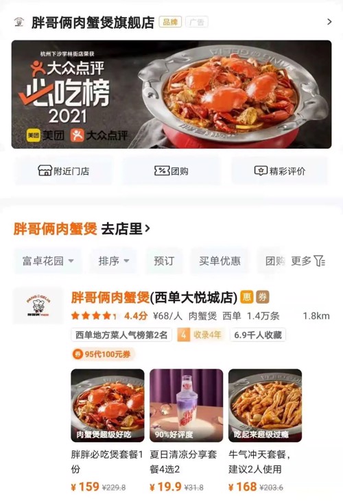 在美团上,胖哥俩肉蟹煲还是2021大众点评必吃榜单之一,还被评为北京西单地区地方菜人气榜第2名。