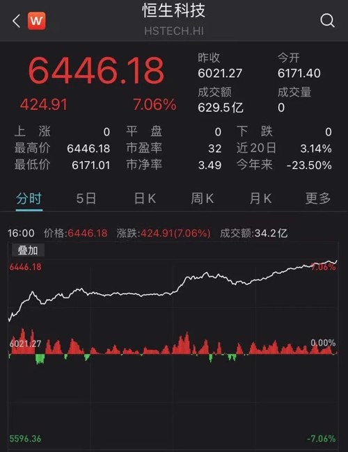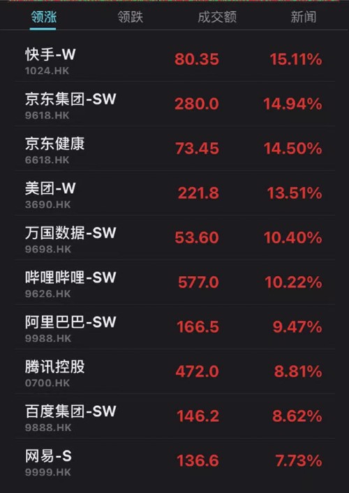 不仅腾讯,港股科技板块今日全面反弹,恒生科技指数收涨7.06%。快手(01024)和京东(09618)均涨15%上下,美团(03690)上涨13.51%,成为今日表现最佳蓝筹股,阿里巴巴(09988)则终止九连跌,收涨9.47%。