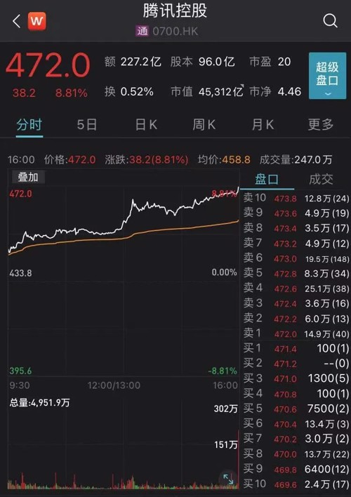 连续三日回购后,腾讯(00700)今早延续前两个交易日的反弹走势,高开3%报446.8港元,收盘报472港元,上涨8.81%,单日市值增加超过3600亿港币。