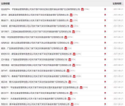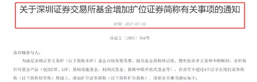 主要内容基本都是:根据深交所《关于深圳证券交易所基金增加扩位证券简称有关事项的通知(深证上[2021]764 号)》,经向深交所申请,自2021年8月23日起,公司旗下深交所基金新增扩位证券简称,扩位简称适用于交易、申购赎回及行情展示。