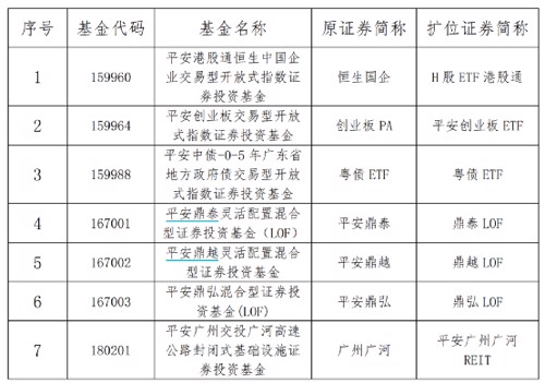再看平安基金旗下也有7只基金扩位证券简称,比如“创业板PA”改为“平安创业板ETF”,“恒生国企”改为“H股ETF港股通”,“广州广河”变成“平安广州广河REIT”。