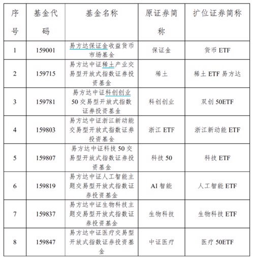 拿易方达基金的公告来说,旗下28只ETF、LOF等上市基金,都扩位了证券简称,比如“稀土”变成了“稀土ETF易方达”,“科创创业”变成了“双创50ETF”,“AI智能”变成了“人工智能ETF”。