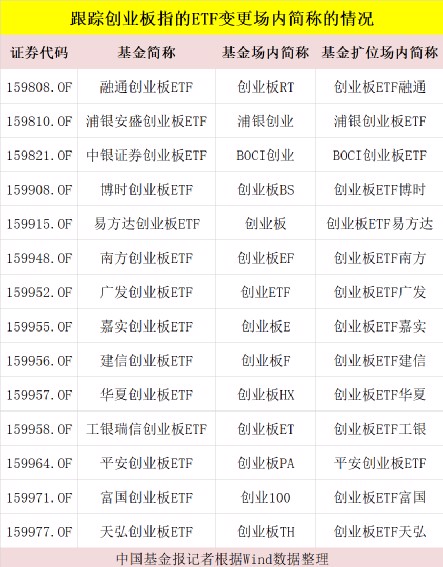 基金君举个例子,大家就能感受到这种扩位简称的好处,比如跟踪创业板指(399006.SZ)的ETF有14只,原来他们在场内的简称分别为创业板RT、浦银创业、BOCI创业、创业板BS、创业板、创业板EF、创业ETF等,现在扩位场内简称变成了创业板ETF融通、浦银创业板ETF、BOCI创业板ETF、创业板ETF博时、创业板ETF易方达、创业板ETF南方、创业板ETF广发等,变得非常明确,投资者一看就知道。