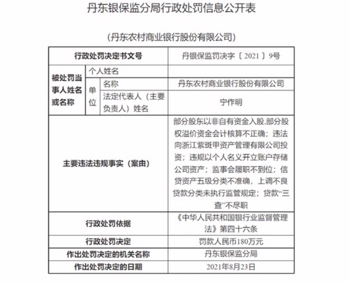 8月27日,丹东银保监分局发布的行政处罚信息公开表显示,丹东农村商业银行被罚款180万元。