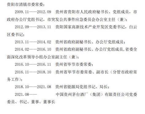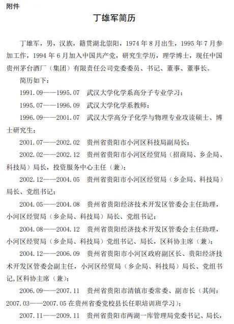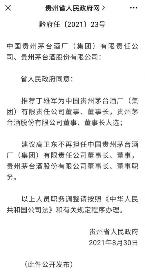 8月30日,贵州省人民政府网发布《省人民政府关于丁雄军等同志职务调整的通知》:省人民政府同意推荐丁雄军为中国贵州茅台酒厂(集团)有限责任公司董事、董事长,贵州茅台酒股份有限公司董事、董事长人选。