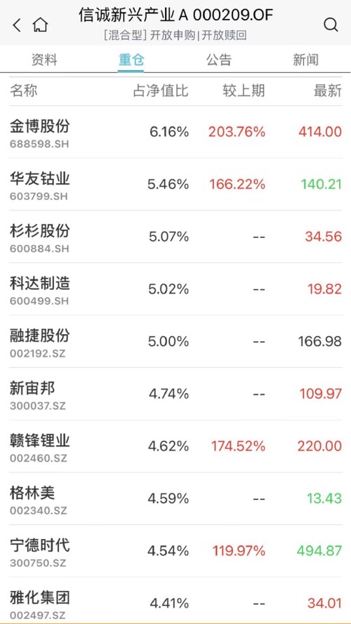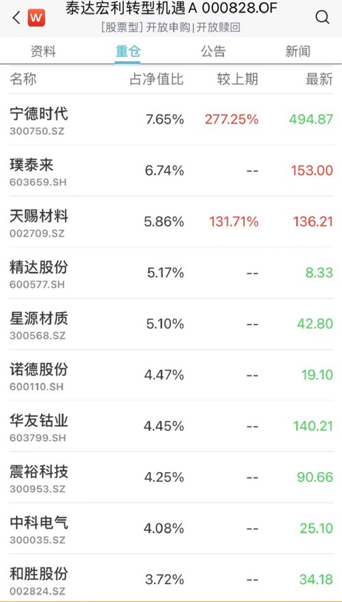 泰达宏利转型机遇二季度仍然集中配置在高景气的新能源车产业链中游和上游,其重配的天赐材料和诺德股份本月涨幅都超35%,其他几只重仓股如中科电气、璞泰来、华友钴业等也涨势不错。