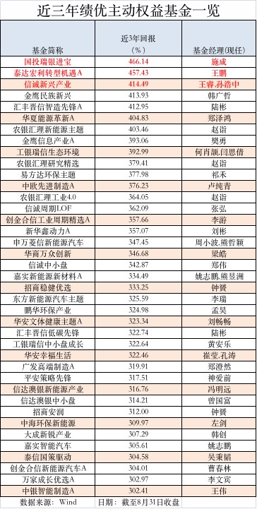 截至8月31日收盘,施成管理的国投瑞银进宝以466.14%的回报,“新晋”成为近三年主动权益基金“冠军”。