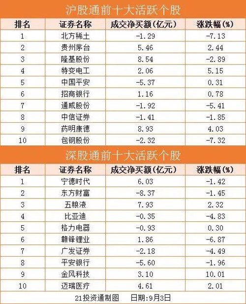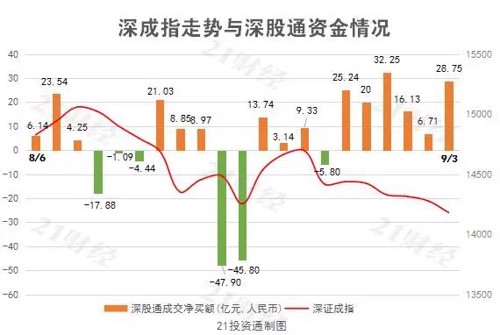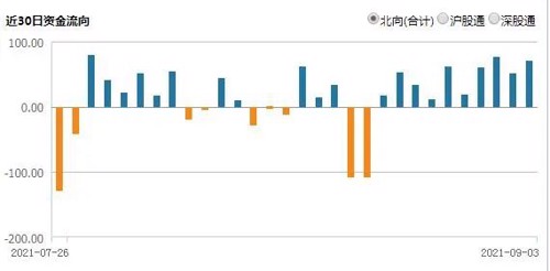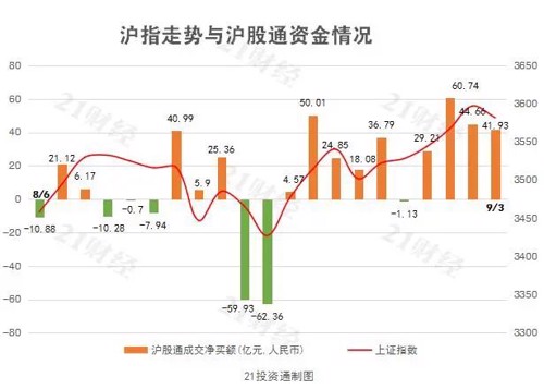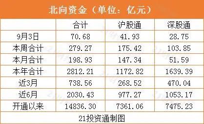 据21投资通(微信号ID:touzit21)智能监测,9月3日,北向资金净买入70.68亿元,已连续10个交易日净买入。其中沪股通净买入41.93亿元,深股通净买入28.75亿元。本周,北向资金累计净买入279.27亿元,其中沪股通累计净卖出175.42亿元,深股通累计净买入103.85亿元。