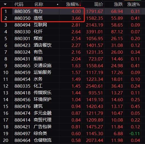 行业方面,电力、造纸、互联网、化纤、煤炭等板块大涨。发改委推动开展绿色电力交易试点,构建以新能源为主体的新型电力系统。