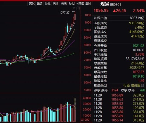 煤炭股也持续上涨,焦煤焦炭等期货品种屡屡涨停新高,煤炭板块也不断新高。