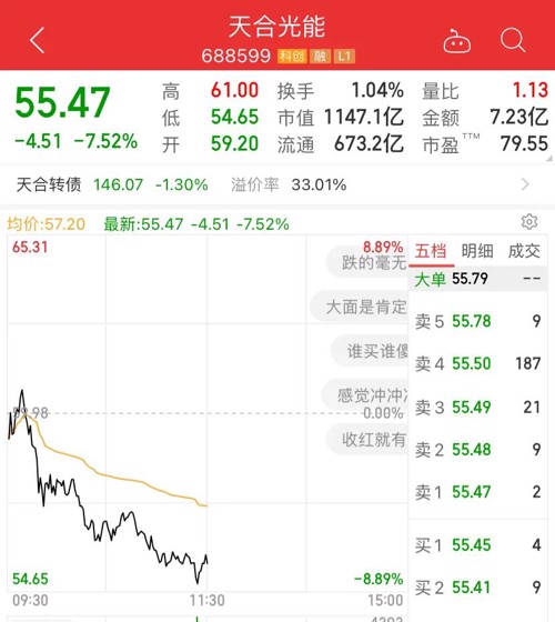 市场窄幅震荡,多只千亿级的重磅个股大幅杀跌。1000多亿的光伏组件龙头天合光能,大跌逾7%。