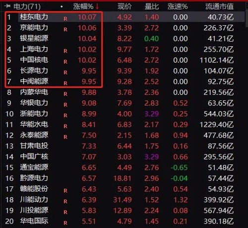 电力股掀起涨停潮,桂东电力、京能电力、上海电力、中国核电、长源电力等纷纷涨停。