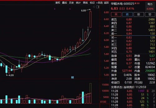 1000多亿的水电股华能水电,上午也大涨逾8%。