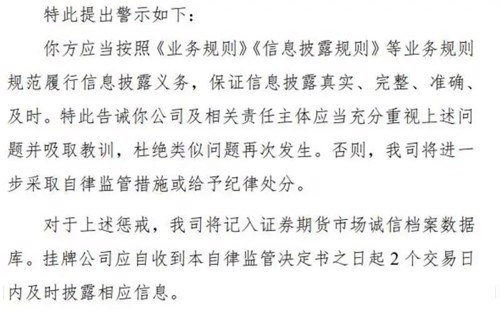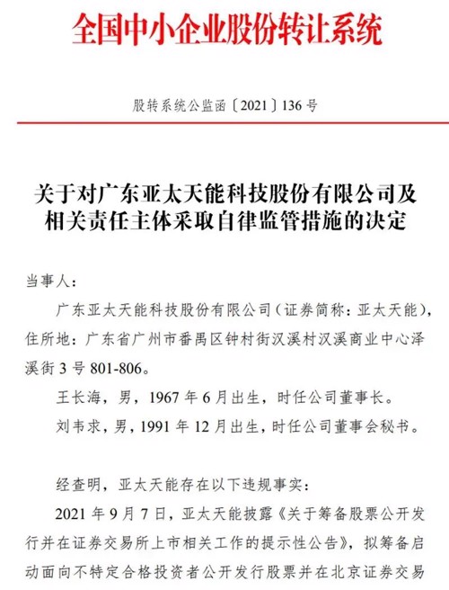 基于此,全国股转公司对亚太天能、王长海、刘韦求分别采取了出具警示函的自律监管措施。