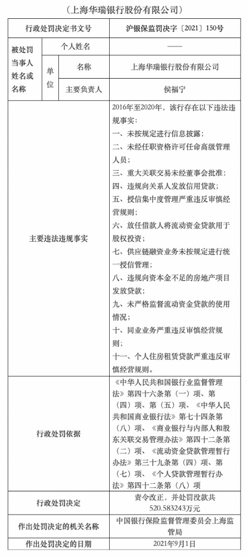 日前,上海华瑞银行因存在11项违法违规事实,被上海银保监局罚没超520万元。具体而言,该行违法违规事实主要涉及同业、授信、贷款等银行机构违法违规“重灾区”。