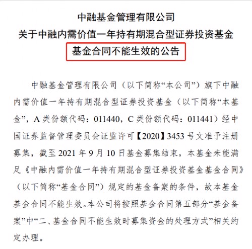 9月18日,中融基金发布公告称,公司旗下中融内需价值一年持有期混合型基金,经中国证券监督管理委员会证监许可准予注册募集,截至2021年9月10日基金募集结束,基金未能满足该只基金合同规定的基金备案的条件,故本基金的基金合同不能生效。