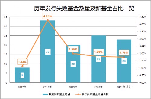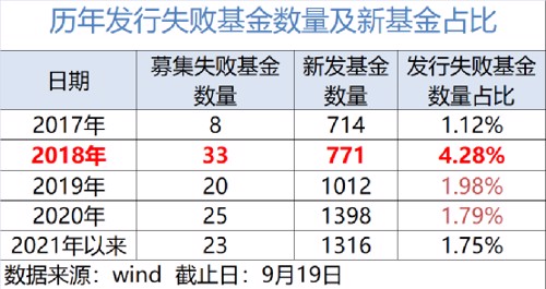 Wind数据显示,截至今年9月19日,今年以来新发基金数量为1316只,23只募集失败基金占比为1.75%。这一数据比2019年的1.98%、2020年的1.79%占比都要低。