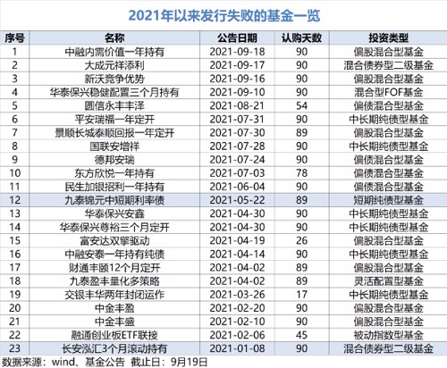 数据显示,截至9月19日,今年发行失败的23只基金中,有3只产品属于华泰保兴基金,中金基金、九泰基金、中融基金等旗下也各有2只产品募集失败。
