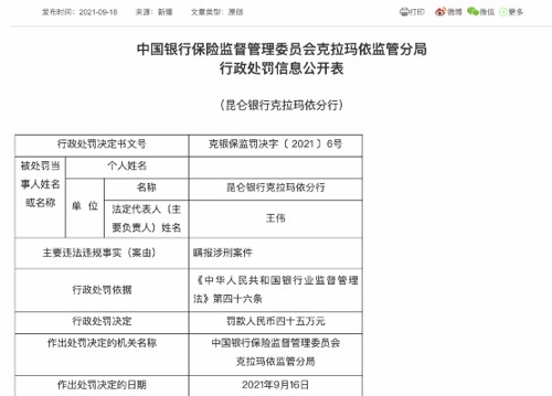 9月18日,根据银保监会新疆监管局官网显示,昆仑银行克拉玛依分行因瞒报涉刑案件,中国银保监会克拉玛依监管分局根据《中华人民共和国银行业监督管理法》第四十六条,决定对其处以四十五万元罚款。此外,昆仑银行克拉玛依分行胜利路支行因内部管理不到位,致使发生员工挪用资金案件,克拉玛依监管分局决定对其罚款人民币五十万元。同时,相关负责人被警告并处罚款。